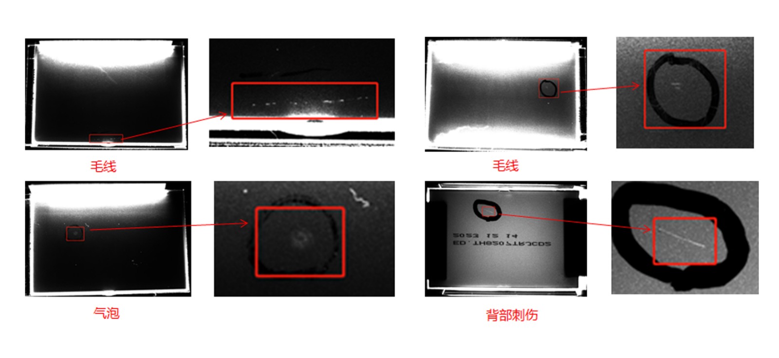 刮伤、毛线、内污、气泡、杂质、裂痕、切割不良、贴歪、白点、水纹、破损等缺陷